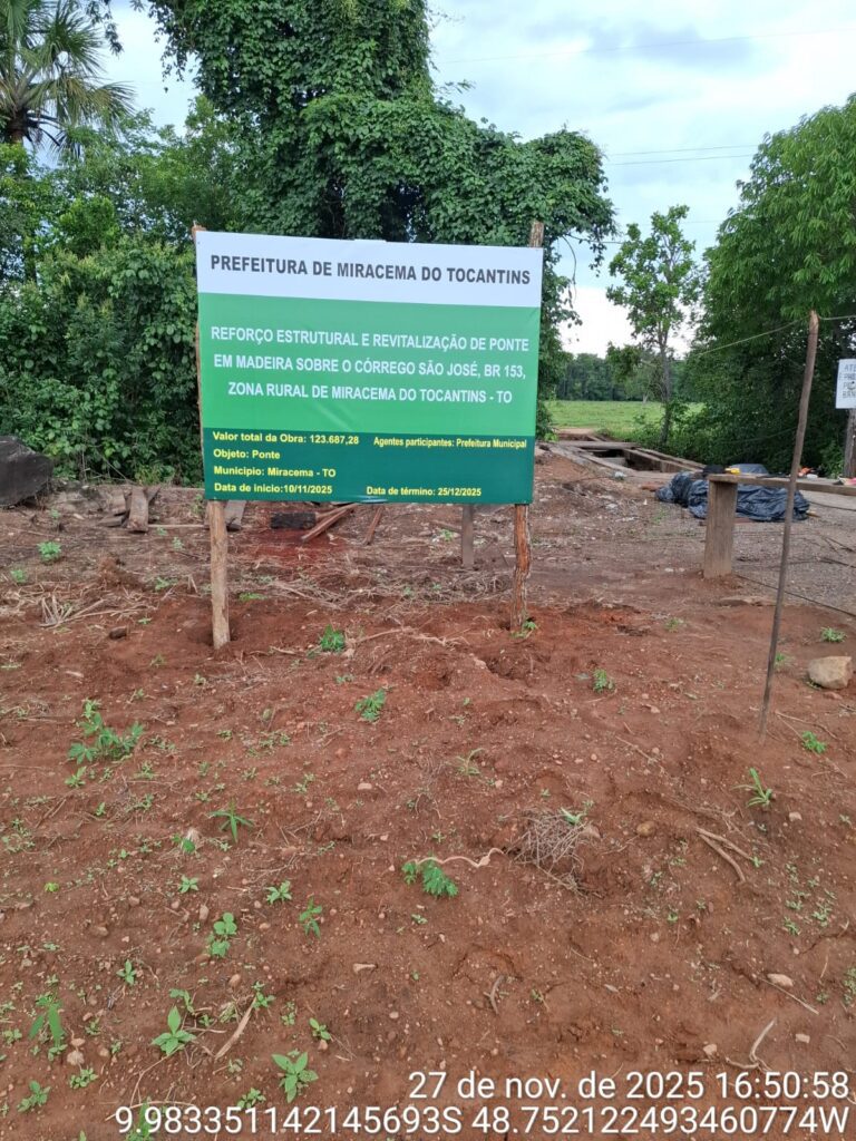 A Prefeitura de Miracema do Tocantins, por meio do Departamento de Engenharia Civil, acompanha de perto a obra de reforço estrutural e revitalização da ponte de madeira sobre o Córrego São José, localizada na BR-153, zona rural do município, próximo à cidade de Paraíso do Tocantins.