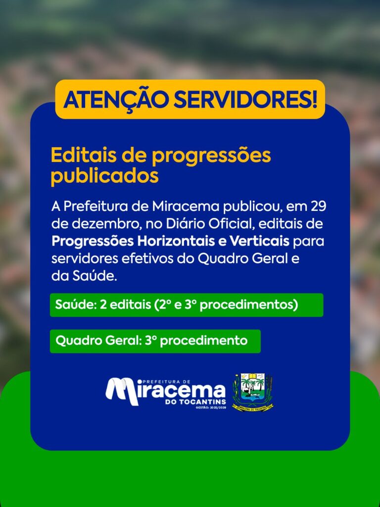 A Prefeitura Municipal de Miracema do Tocantins publicou, no dia 29 de dezembro, no Diário Oficial do Município, três editais de Progressões Horizontais e Verticais destinados aos servidores efetivos do Quadro Geral e da Saúde. Ainda no mês de dezembro, já havia sido publicado edital específico para os profissionais da Educação que possuem interstício de progressão no mês de setembro.